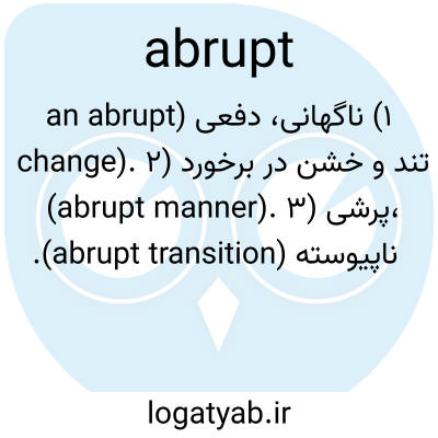 ۱) ناگهانی، دفعی (an abrupt change). ۲) تند و خشن در برخورد (abrupt manner). ۳) پرشی، ناپیوسته (abrupt transition).