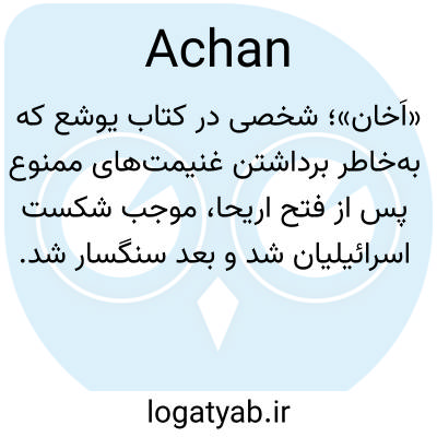 📌 (در کتاب مقدس) عضوی از قبیله یهودا که به همراه خانوادهاش به دلیل دزدیدن غنایم ممنوعه سنگسار شدند.