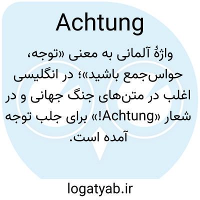 واژهٔ آلمانی به معنی «توجه، حواس‌جمع باشید»؛ در انگلیسی اغلب در متن‌های جنگ جهانی و در شعار «Achtung!» برای جلب توجه آمده است.