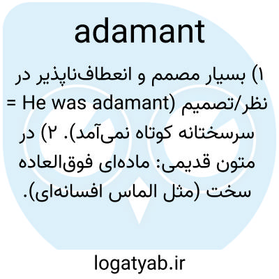 ۱) بسیار مصمم و انعطاف‌ناپذیر در نظر/تصمیم (He was adamant = سرسختانه کوتاه نمی‌آمد). ۲) در متون قدیمی: ماده‌ای فوق‌العاده سخت (مثل الماس افسانه‌ای).