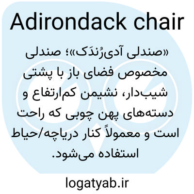 📌 یک صندلی راحتی محکم برای استفاده در فضای باز، ساخته شده از تختههای چوبی پهن، با پشتی شیبدار و نشیمنگاهی که اغلب به سمت آن متمایل میشود.