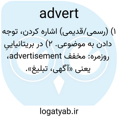 ۱) (رسمی/قدیمی) اشاره کردن، توجه دادن به موضوعی. ۲) در بریتانیاییِ روزمره: مخفف advertisement، یعنی «آگهی، تبلیغ».