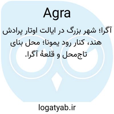 آگرا؛ شهر بزرگ در ایالت اوتار پرادش هند، کنار رود یمونا؛ محل بنای تاج‌محل و قلعهٔ آگرا.