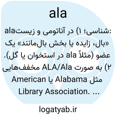 ala؛ ۱) در آناتومی و زیست‌شناسی: «بال، زایده یا بخش بال‌مانند» یک عضو (مثلاً ala در استخوان یا گل). ۲) به صورت ALA/Ala مخفف‌هایی مثل Alabama یا American Library Association. ۳) در شکل «à la»: «به سبکِ / به روشِ فلان».