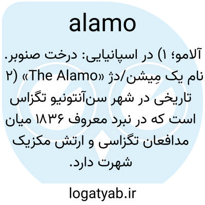 آلامو؛ ۱) در اسپانیایی: درخت صنوبر. ۲) «The Alamo» نام یک مِیشن/دژ تاریخی در شهر سن‌آنتونیو تگزاس است که در نبرد معروف ۱۸۳۶ میان مدافعان تگزاسی و ارتش مکزیک شهرت دارد.