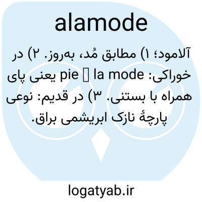 آلامد، ا-لا-مود، قیمومیت و صفت. مطابق با مد یا مُد. - اسم. نوعی ابریشم سبک و براق برای روسری، کلاه و غیره. - اسم.