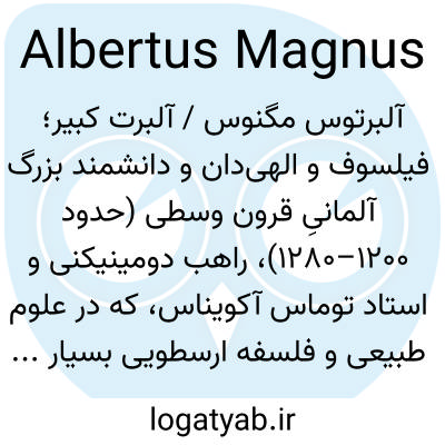 آلبرتوس مگنوس / آلبرت کبیر؛ فیلسوف و الهی‌دان و دانشمند بزرگ آلمانیِ قرون وسطی (حدود ۱۲۰۰–۱۲۸۰)، راهب دومینیکنی و استاد توماس آکویناس، که در علوم طبیعی و فلسفه ارسطویی بسیار اثرگذار بود.