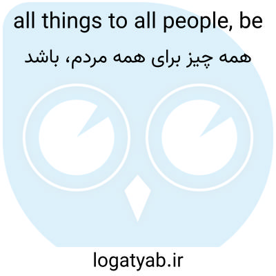 📌 همه را کاملاً راضی کن، مانند آنچه در ... مشکل کمپین فرماندار این است که او سعی دارد برای همه مردم همه چیز باشد. این عبارت ضرب المثلی گاهی اوقات به صورت "همه چیز برای همه مردان بودن" بیان میشود، اما امروزه برای جلوگیری از تبعیض جنسیتی، اغلب مردان با مردم جایگزین میشوند. این عبارت از گفته پولس (اول قرنتیان 9:22) سرچشمه گرفته است: "من برای همه مردم همه چیز هستم تا به هر طریقی برخی را نجات دهم." امروزه این عبارت اغلب در یک زمینه سیاسی ظاهر میشود، اما به صورت منفی بیان میشود، مانند ... او میخواهد عضو خوبی برای کمیته مدرسه باشد، اما نمیتواند برای همه مردم همه چیز باشد.