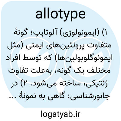 ۱) (ایمونولوژی) آلوتایپ؛ گونهٔ متفاوت پروتئین‌های ایمنی (مثل ایمونوگلوبولین‌ها) که توسط افراد مختلف یک گونه، به‌علت تفاوت ژنتیکی، ساخته می‌شود. ۲) در جانورشناسی: گاهی به نمونهٔ جانوری از جنس مخالف نسبت به گونه‌نمونه گفته می‌شود.