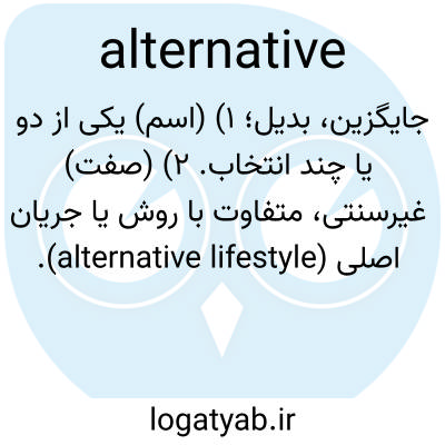 جایگزین، بدیل؛ ۱) (اسم) یکی از دو یا چند انتخاب. ۲) (صفت) غیرسنتی، متفاوت با روش یا جریان اصلی (alternative lifestyle).
