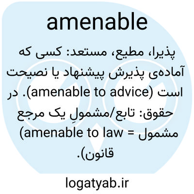 پذیرا، مطیع، مستعد: کسی که آماده‌ی پذیرش پیشنهاد یا نصیحت است (amenable to advice). در حقوق: تابع/مشمولِ یک مرجع (amenable to law = مشمول قانون).