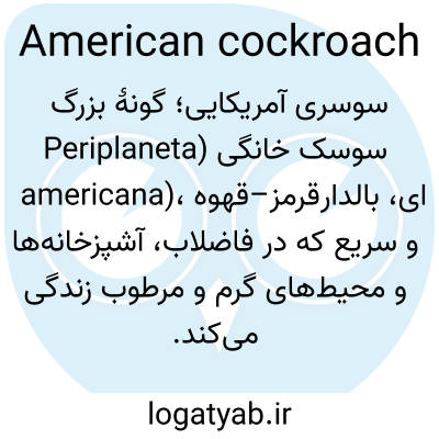 📌 سوسکی بزرگ به رنگ قهوه‌ای مایل به قرمز، با نام علمی Periplaneta americana، که در اصل در جنوب ایالات متحده یافت می‌شد اما اکنون به طور گسترده پراکنده شده است.