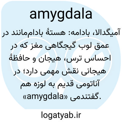 آمیگدالا، بادامه: هستهٔ بادام‌مانند در عمق لوب گیجگاهی مغز که در احساس ترس، هیجان و حافظهٔ هیجانی نقش مهمی دارد؛ در آناتومی قدیم به لوزه هم «amygdala» می‌گفتند.
