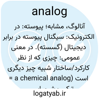 آنالوگ، مشابه؛ پیوسته: در الکترونیک: سیگنال پیوسته در برابر دیجیتال (گسسته). در معنی عمومی: چیزی که از نظر کارکرد/ساختار شبیه چیز دیگری است (a chemical analog = ترکیب شیمیایی مشابه).