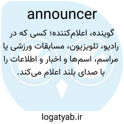 📌 کسی که اعلام می‌کند، به خصوص کسی که برنامه‌ها را معرفی می‌کند، اخبار ارائه می‌دهد، تبلیغات را می‌خواند و سایر وظایف مشابه را از طریق رادیو یا تلویزیون انجام می‌دهد.