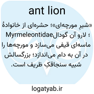 📌 هر یک از چندین حشره متعلق به خانواده Myrmeleontidae، از راسته Neuroptera، که لاروهای آنها گودالی در شن حفر می‌کنند و در آنجا کمین می‌کنند تا مورچه‌ها یا حشرات دیگری را که جای پای خود را گم می‌کنند، شکار کنند.