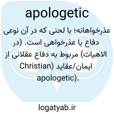 عذرخواهانه؛ با لحنی که در آن نوعی دفاع یا عذرخواهی است. (در الاهیات) مربوط به دفاع عقلانی از ایمان/عقاید (Christian apologetic).