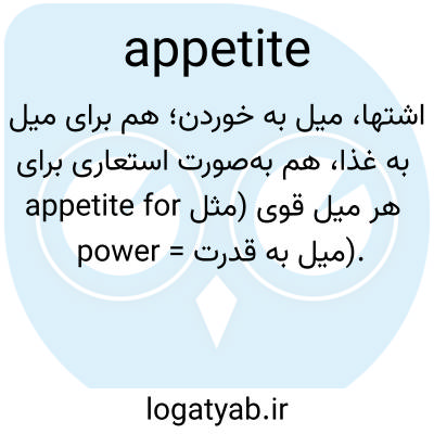 اشتها، میل به خوردن؛ هم برای میل به غذا، هم به‌صورت استعاری برای هر میل قوی (مثل appetite for power = میل به قدرت).