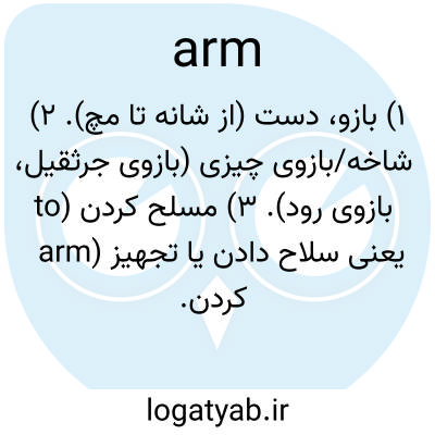 ۱) بازو، دست (از شانه تا مچ). ۲) شاخه/بازوی چیزی (بازوی جرثقیل، بازوی رود). ۳) مسلح کردن (to arm) یعنی سلاح دادن یا تجهیز کردن.
