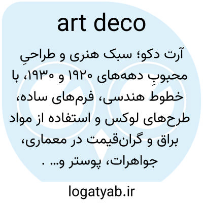 📌 سبکی از هنر تزئینی که در اصل در دهه ۱۹۲۰ میلادی توسعه یافت و در دهه ۱۹۶۰ احیا شد، و عمدتاً با نقوش هندسی، اشکال منحنی، خطوط بیرونی کاملاً مشخص، اغلب رنگهای جسورانه و استفاده از مواد مصنوعی مانند پلاستیک مشخص میشود.