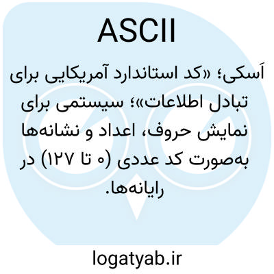 📌 کد استاندارد آمریکایی برای تبادل اطلاعات: یک کد استاندارد، متشکل از ۱۲۸ ترکیب ۷ بیتی، برای کاراکترهای ذخیره شده در یک کامپیوتر یا برای انتقال بین کامپیوترها.