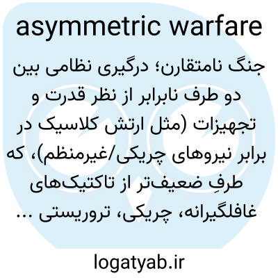 📌 جنگی که در آن گروه‌ها یا ملت‌های متخاصم از منابع نظامی نابرابر برخوردارند و حریف ضعیف‌تر از سلاح‌ها و تاکتیک‌های نامتعارف، مانند تروریسم، برای بهره‌برداری از آسیب‌پذیری‌های دشمن استفاده می‌کند.
