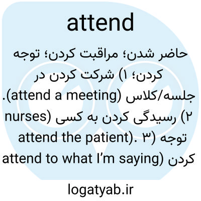 حاضر شدن؛ مراقبت کردن؛ توجه کردن؛ ۱) شرکت کردن در جلسه/کلاس (attend a meeting). ۲) رسیدگی کردن به کسی (nurses attend the patient). ۳) توجه کردن (attend to what I’m saying).