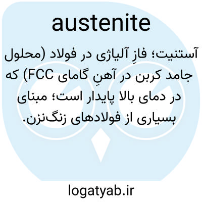آستنیت؛ فازِ آلیاژی در فولاد (محلول جامد کربن در آهنِ گامای FCC) که در دمای بالا پایدار است؛ مبنای بسیاری از فولادهای زنگ‌نزن.