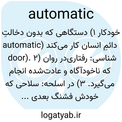 خودکار ۱) دستگاهی که بدون دخالتِ دائمِ انسان کار می‌کند (automatic door). ۲) در روان‌شناسی: رفتاری که ناخودآگاه و عادت‌شده انجام می‌گیرد. ۳) در اسلحه: سلاحی که خودش فشنگ بعدی را تغذیه می‌کند.