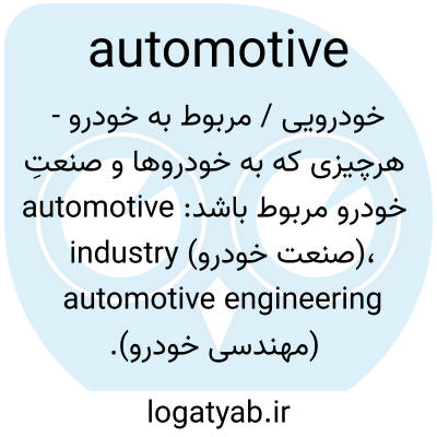 خودرویی / مربوط به خودرو - هرچیزی که به خودروها و صنعتِ خودرو مربوط باشد: automotive industry (صنعت خودرو)، automotive engineering (مهندسی خودرو).