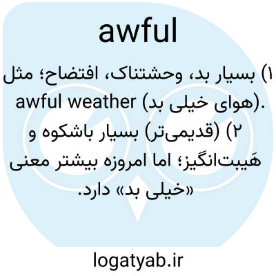 ۱) بسیار بد، وحشتناک، افتضاح؛ مثل awful weather (هوای خیلی بد). ۲) (قدیمی‌تر) بسیار باشکوه و هَیبت‌انگیز؛ اما امروزه بیشتر معنی «خیلی بد» دارد.