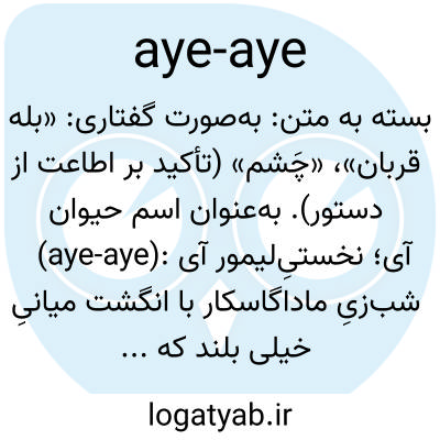 بسته به متن: به‌صورت گفتاری: «بله قربان»، «چَشم» (تأکید بر اطاعت از دستور). به‌عنوان اسم حیوان (aye-aye): لیمور آی‌آی؛ نخستیِ شب‌زیِ ماداگاسکار با انگشت میانیِ خیلی بلند که برای بیرون آوردن لارو حشرات از چوب استفاده می‌کند؛ گونه‌ای در معرض خطر انقراض.