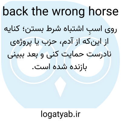 📌 همچنین، روی اسب اشتباه شرط بستن. حدس اشتباه زدن یا قضاوت نادرست در مورد نتیجه آینده، مانند اینکه جونز فقط چند صد رأی کسب کرد؛ ما آشکارا از اسب اشتباه حمایت کردیم، یا اینکه روی افزایش شدید قیمت IBM حساب میکردیم، شرطبندی روی اسب اشتباه بود. انتقال پول از شرطبندی روی اسبی که در مسابقه برنده نمیشود، کاربردی که به اواخر دهه ۱۶۰۰ برمیگردد، این اصطلاح به طور گسترده در مورد انتخابات و سایر موقعیتهای با نتیجه نامشخص به کار میرود.