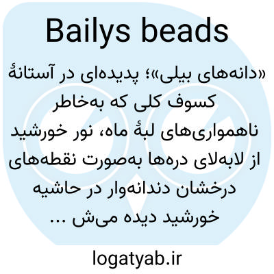 📌 لکههای نوری که به نظر میرسد ماه را احاطه کردهاند، شبیه رشتهای از مهرههای نورانی، که بلافاصله قبل و بعد از کسوف کامل قابل مشاهده هستند و ناشی از تابش نور خورشید از میان کوههای سطح ماه میباشند.