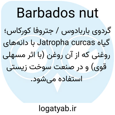 گردوی باربادوس / جتروفا کورکاس؛ گیاه Jatropha curcas با دانه‌های روغنی که از آن روغن (با اثر مسهلی قوی) و در صنعت سوخت زیستی استفاده می‌شود.