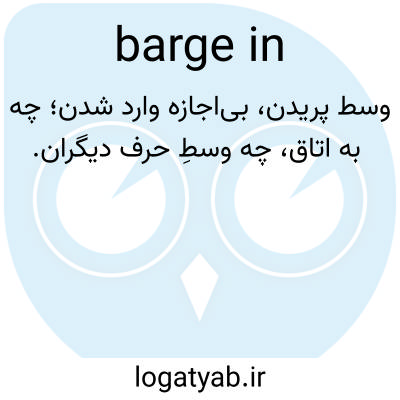 📌 بیادبانه یا ناگهانی وارد شدن، مزاحم شدن. برای مثال، Her mother never knocked but just burges in. این اصطلاح همچنین به معنای قطع کردن مکالمه به کار میرود، مانند Who asked you to barge into our conversation? این عبارات به معنای «برخورد کردن» یا «کوبیدن» هستند که ممکن است به تمایل این شناورهای دست و پا چلفتی به برخورد با سایر شناورها اشاره داشته باشد. [اواخر دهه ۱۸۰۰]