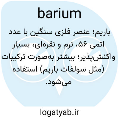 📌 عنصری فلزی، سفیدرنگ، چکشخوار، فعال، دو ظرفیتی، که عمدتاً به صورت ترکیبی به صورت باریت یا ویتریت یافت میشود. Ba; 137.34; 56; 3.5 در دمای 20 درجه سانتیگراد.