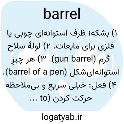 ۱) بشکه؛ ظرف استوانه‌ای چوبی یا فلزی برای مایعات. ۲) لولهٔ سلاح گرم (gun barrel). ۳) هر چیزِ استوانه‌ای‌شکل (barrel of a pen). ۴) فعل: خیلی سریع و بی‌ملاحظه حرکت کردن (to barrel down the road).