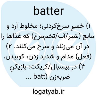 ۱) خمیرِ سرخ‌کردنی؛ مخلوط آرد و مایع (شیر/آب/تخم‌مرغ) که غذاها را در آن می‌زنند و سرخ می‌کنند. ۲) (فعل) مدام و شدید زدن، کوبیدن. ۳) در بیسبال/کریکت: بازیکنِ ضربه‌زن (batter/batsman).