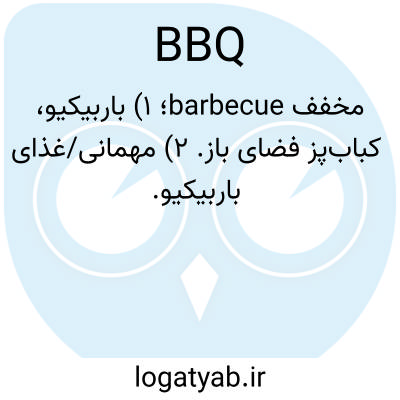 مخفف barbecue؛ ۱) باربیکیو، کباب‌پز فضای باز. ۲) مهمانی/غذای باربیکیو.