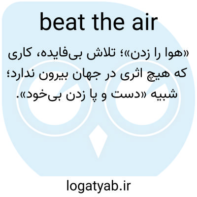 📌 همچنین، به باد غلبه کن. به تلاشهای بیهوده ادامه بده، بیهدف بجنگ. برای مثال، کاندیداهای ریاست جمهوری آنقدر شبیه هم بودند که فکر میکردیم رأی ما مثل کوبیدن هواست. این عبارات تصویر واضحی از کسی را تداعی میکنند که برای هیچ و پوچ تلاش میکند. [اواخر دهه ۱۳۰۰]