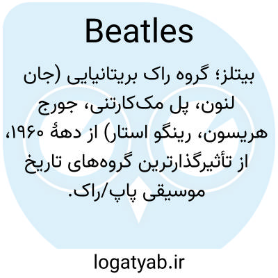 📌 (با فعل جمع استفاده می‌شود)، گروه راک اند رول بریتانیایی (۱۹۶۲–۷۰) شامل جورج هریسون (۱۹۴۳–۲۰۰۱)، جان (وینستون) لنون (۱۹۴۰–۸۰)، پل (جیمز) مک‌کارتنی (متولد ۱۹۴۲) و رینگو استار (ریچارد استارکی) (متولد ۱۹۴۰).