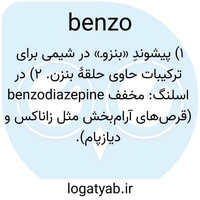 ۱) پیشوندِ «بنزوـ» در شیمی برای ترکیبات حاوی حلقهٔ بنزن. ۲) در اسلنگ: مخفف benzodiazepine (قرص‌های آرام‌بخش مثل زاناکس و دیازپام).