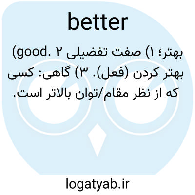 بهتر؛ ۱) صفت تفضیلی good. ۲) بهتر کردن (فعل). ۳) گاهی: کسی که از نظر مقام/توان بالاتر است.