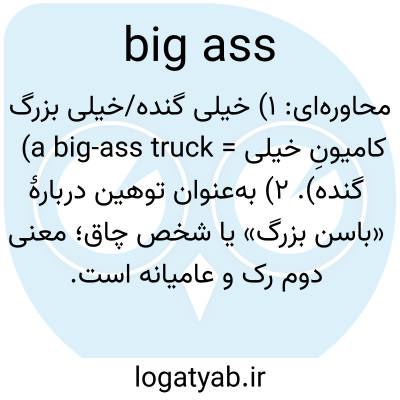 محاوره‌ای: ۱) خیلی گنده/خیلی بزرگ (a big-ass truck = کامیونِ خیلی گنده). ۲) به‌عنوان توهین دربارهٔ «باسن بزرگ» یا شخص چاق؛ معنی دوم رک و عامیانه است.