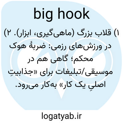 ۱) قلاب بزرگ (ماهی‌گیری، ابزار). ۲) در ورزش‌های رزمی: ضربهٔ هوک محکم؛ گاهی هم در موسیقی/تبلیغات برای «جذابیتِ اصلیِ یک کار» به‌کار می‌رود.