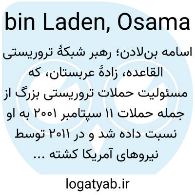 📌 یک تروریست اسلامی و رئیس شبکه تروریستی القاعده. بن لادن که در خانوادهای ثروتمند در عربستان سعودی متولد شد، پس از حمله اتحاد جماهیر شوروی به افغانستان در سال ۱۹۷۹، برای آموزش جنگجویان اسلامی معروف به مجاهدین به افغانستان رفت. پس از خروج شوروی در سال ۱۹۸۹، او به عربستان سعودی بازگشت. در طول جنگ خلیج فارس، او به شدت با حضور آمریکا در عربستان سعودی مخالفت کرد. او در سال ۱۹۹۱ اخراج شد. او ابتدا به سودان گریخت و سپس در سال ۱۹۹۶ به افغانستان بازگشت و مجموعهای از حملات را علیه اهداف آمریکایی ترتیب داد، از جمله، اعتقاد بر این است که تخریب سفارتخانههای آمریکا در کنیا و تانزانیا در سال ۱۹۹۸ و مرکز تجارت جهانی و پنتاگون در سال ۲۰۰۱ (به حملات ۱۱ سپتامبر مراجعه کنید).