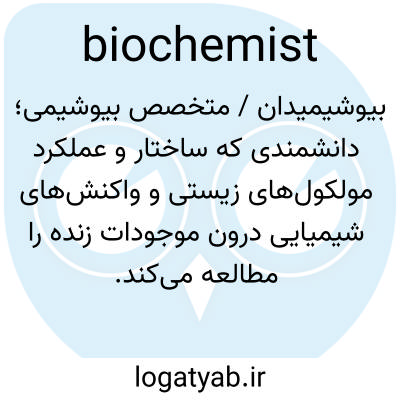 بیوشیمیدان / متخصص بیوشیمی؛ دانشمندی که ساختار و عملکرد مولکول‌های زیستی و واکنش‌های شیمیایی درون موجودات زنده را مطالعه می‌کند.