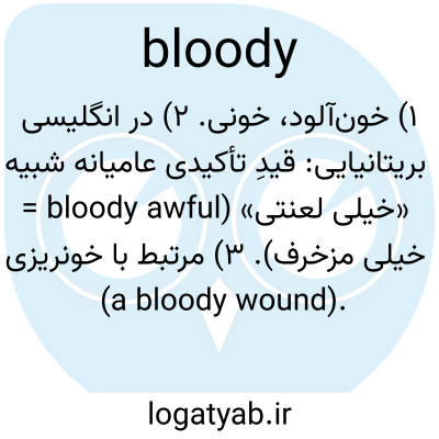۱) خون‌آلود، خونی. ۲) در انگلیسی بریتانیایی: قیدِ تأکیدی عامیانه شبیه «خیلی لعنتی» (bloody awful = خیلی مزخرف). ۳) مرتبط با خونریزی (a bloody wound).