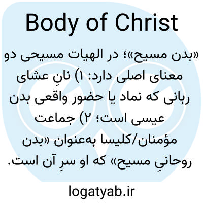 «بدن مسیح»؛ در الهیات مسیحی دو معنای اصلی دارد: ۱) نانِ عشای ربانی که نماد یا حضور واقعی بدن عیسی است؛ ۲) جماعت مؤمنان/کلیسا به‌عنوان «بدن روحانیِ مسیح» که او سرِ آن است.